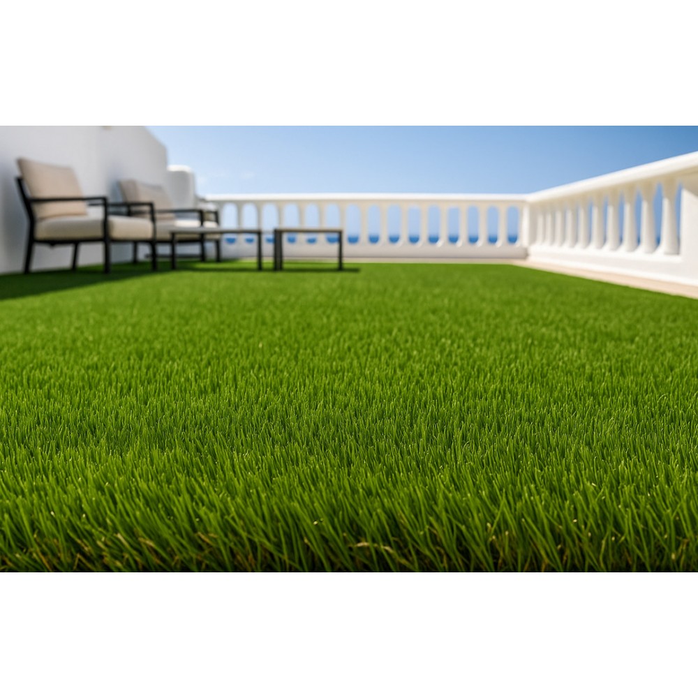 Συνθετικό γκαζόν Skiathos 30mm για εξωτερικό χώρο, κατάλληλο για βεράντες, προσόψεις καταστημάτων, κήπους, αυλές, παιδότοπους, σχολεία, περιβάλλοντες χώρους πισίνας, beach bar, roof gardens κ.α. Αποτελείται από ίσια πράσινη μονόκλωνη ίνα πολυαιθυλενίου και σγουρή μπεζ ίνα πολυπροπυλενίου.